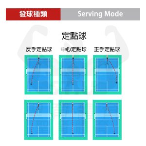 發球方式:21點編程發球、6種交叉球、網前球、平抽球、高遠球、扣殺球、定點球、水平發球、隨機發球、寬/中/窄兩線球、三線球、交叉球、四方球、前/中/後場球。