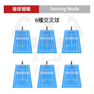 | 發球種類 | 21點編程發球、平擊球、截擊球、高吊球、定點球、垂直發球、兩線球、 三線球、2組交叉球、旋球、隨機發球。 |