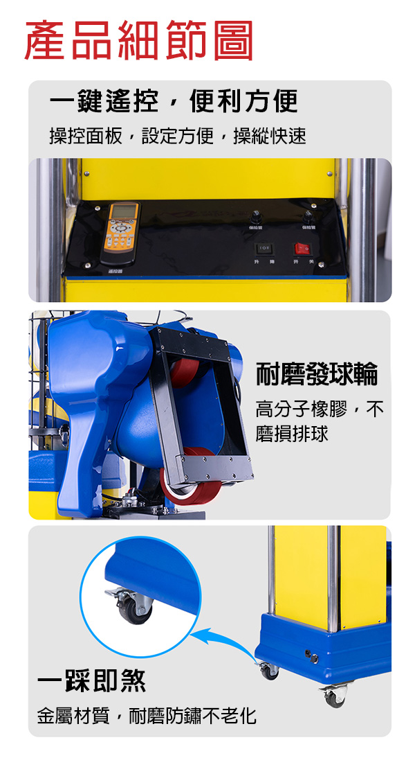 | 特色功能 | 發球裝置升降調節、水平/垂直擺動發球、自動溜球、扣球練習、頻率為0暫停發球、異常報警提醒、開機上電自檢、復位自動暫停。 |